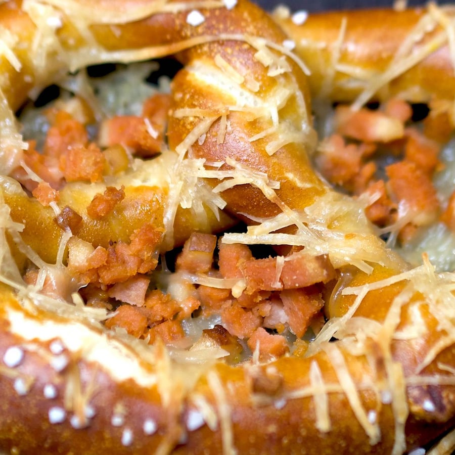 - 3Nach 7 Minuten die Backbleche mit den Brezen rausholen und mit dem veganen Juliette-Reibekäse sowie nach Belieben mit veganen Speckwürfeln bestreuen.