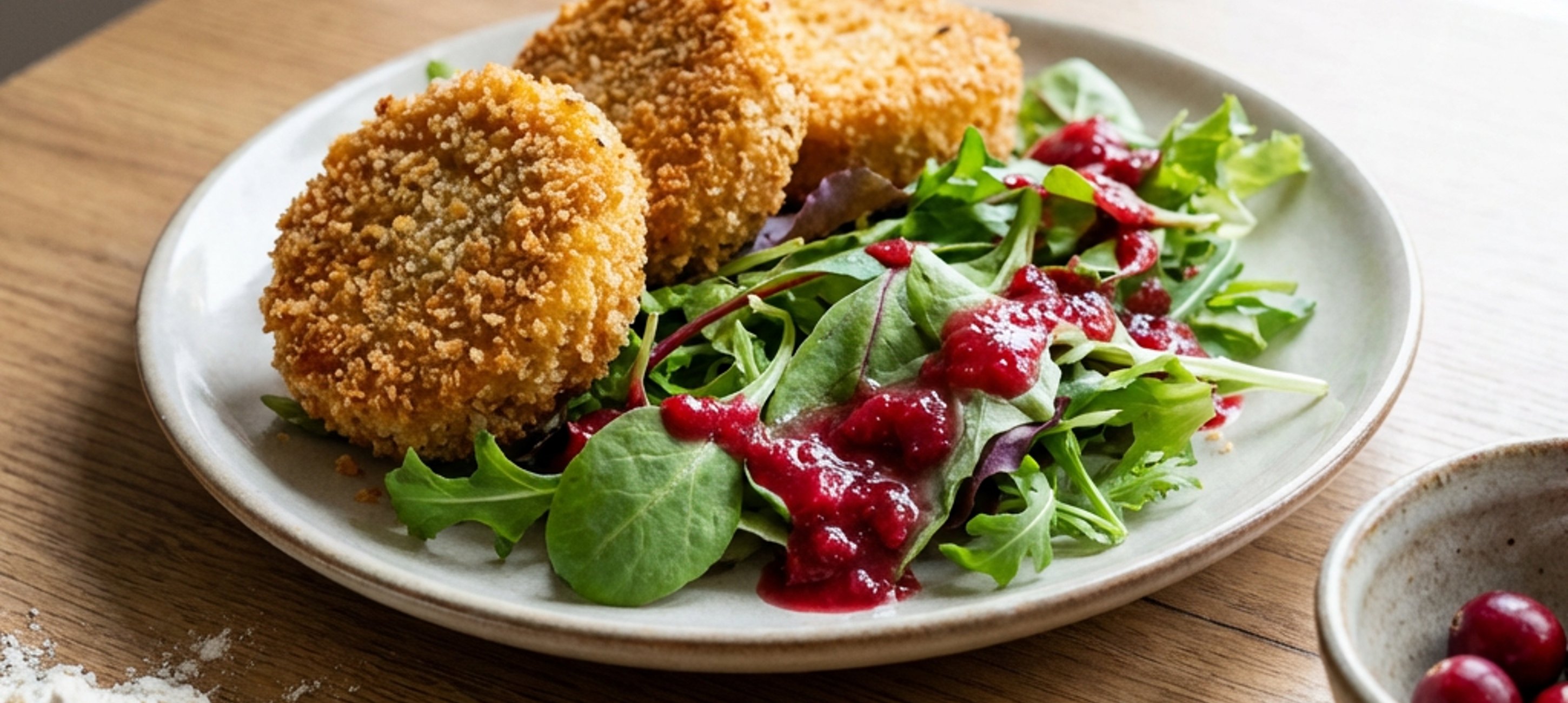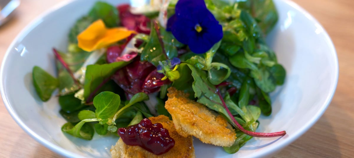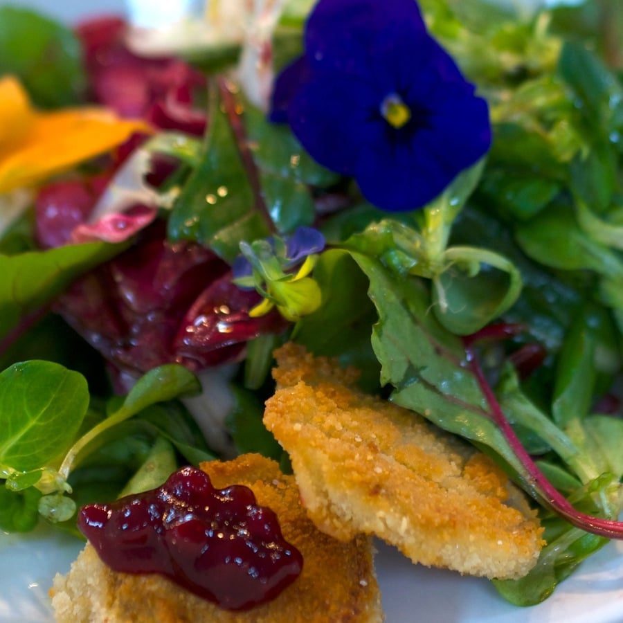 - 9Den gewaschenen Salat auf Teller verteilen, das Dressing darüber träufeln und dann mit den frisch panierten Jil-Scheibchen toppen.