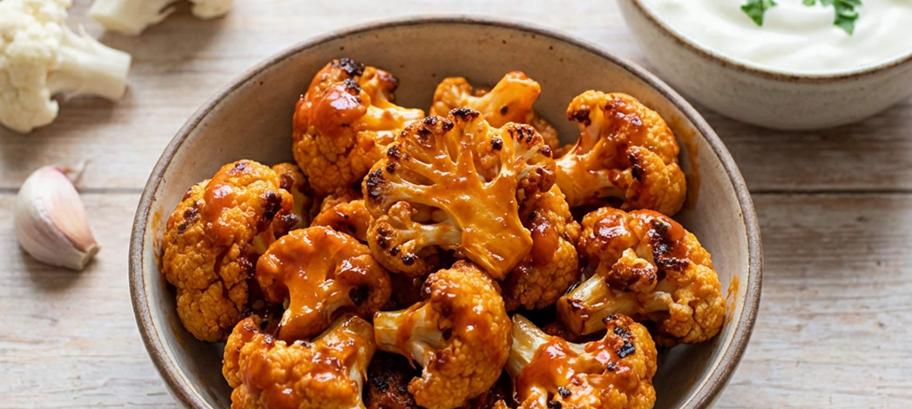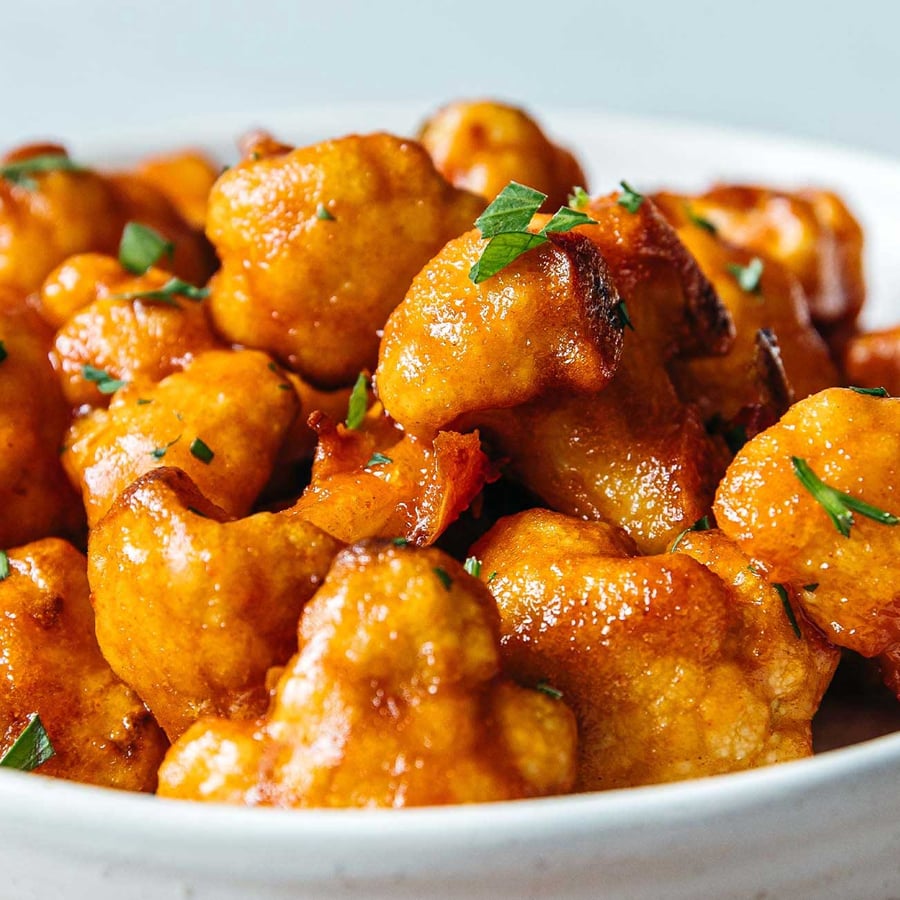 - 5Die gebackenen Blumenkohlröschen mit der Sauce rundum bestreichen und für weitere 10 Minuten zurück in den Ofen geben – dabei gut im Auge behalten, damit nichts anbrennt.