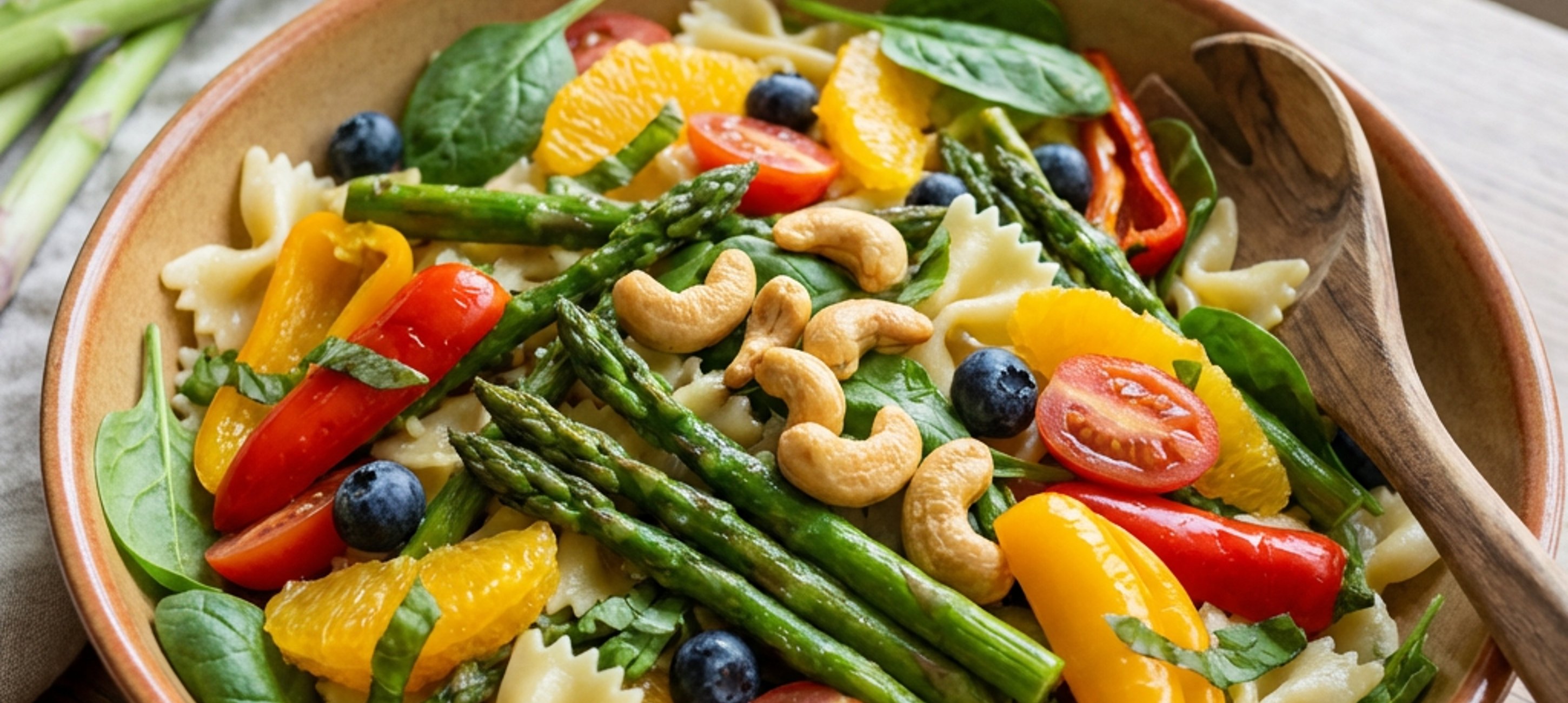 - 8In einer großen Schüssel die gekochten Farfalle mit dem Spargel, den Paprikastücken, den Kirschtomaten, Heidelbeeren und Orangenfilets vermengen.