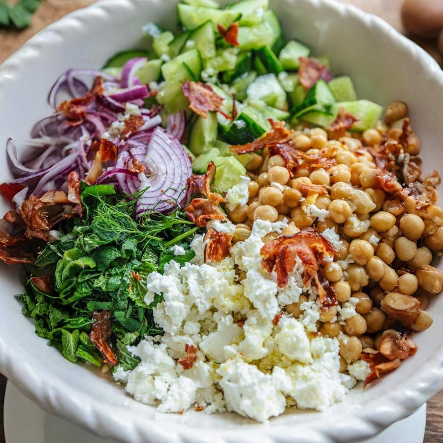 - 3Den gekochten Orzo abgießen und in eine große Schüssel geben. Kichererbsen abtropfen, Gurke würfeln, Kräuter hacken, Zwiebel in feine Streifen schneiden, Feta zerbröseln und alles zusammen mit dem zerkleinerten Bacon unter den Orzo mischen.