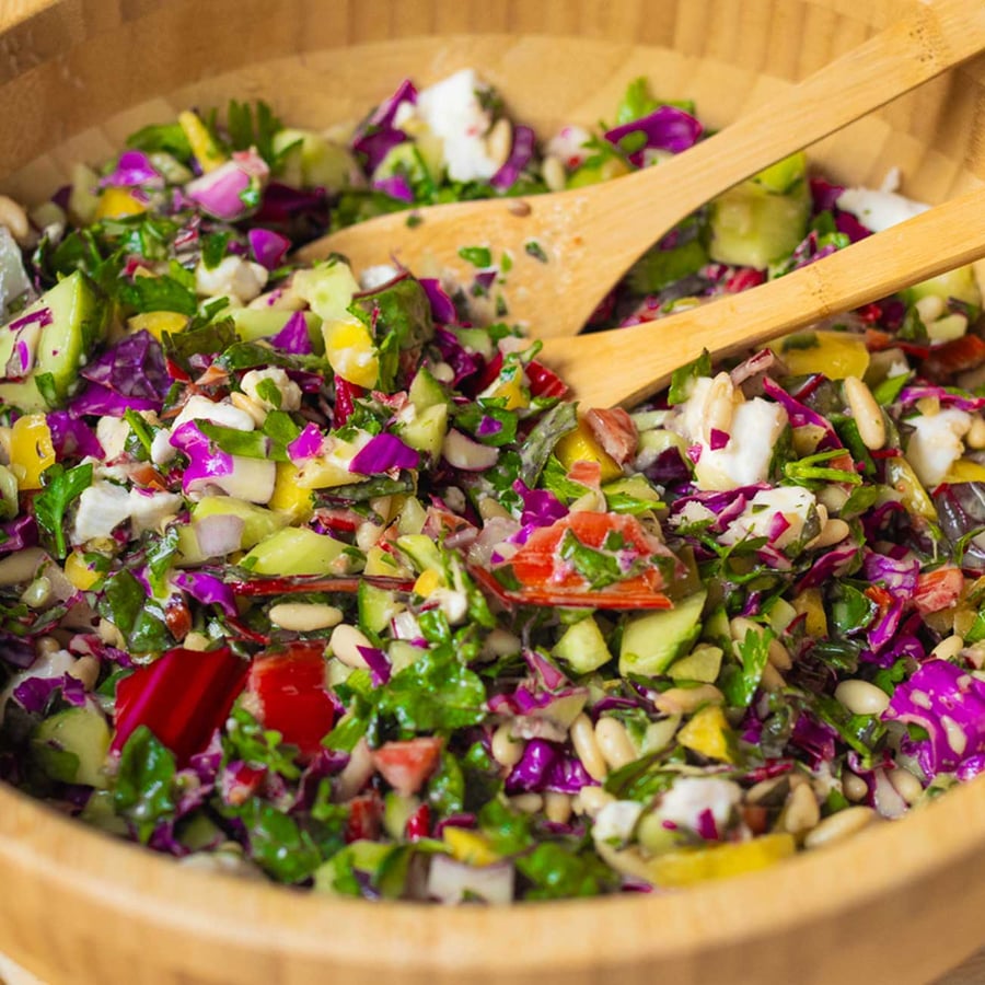 - 6Pinienkerne in einer fettfreien Pfanne rösten und zusammen mit dem veganen Feta über dem Salat verteilen.