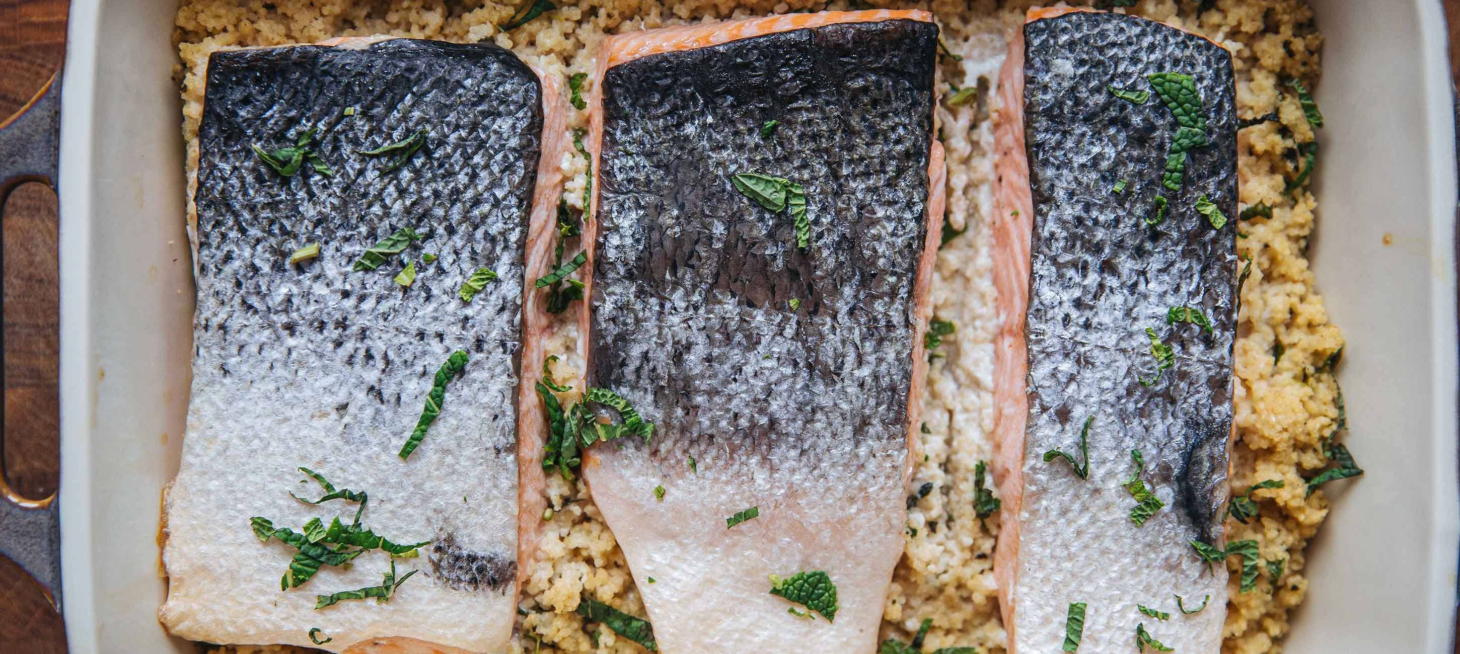 - 3Die Lachsfilets mit der Hautseite nach oben auf den Couscous legen. Im vorgeheizten Ofen 15–17 Minuten bei 180–185 °C backen.