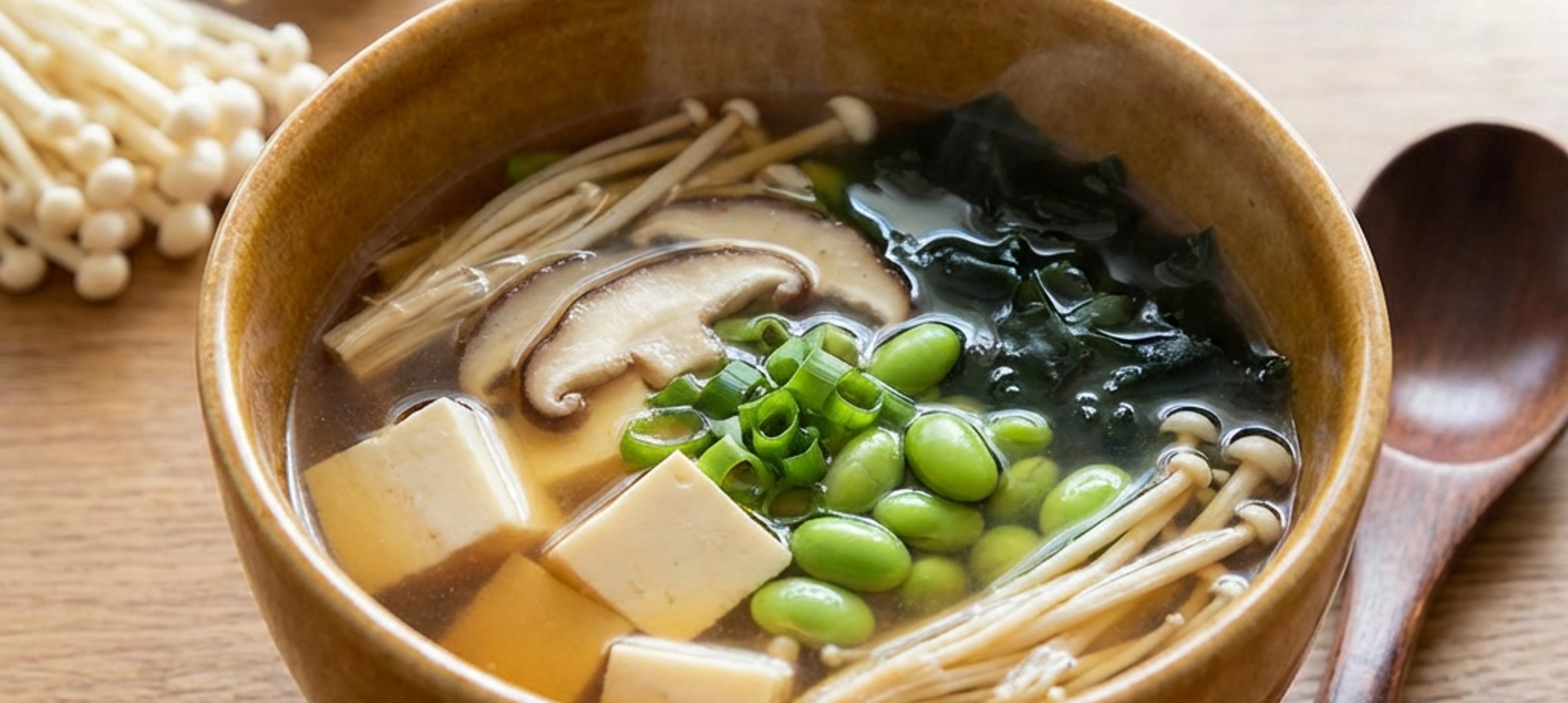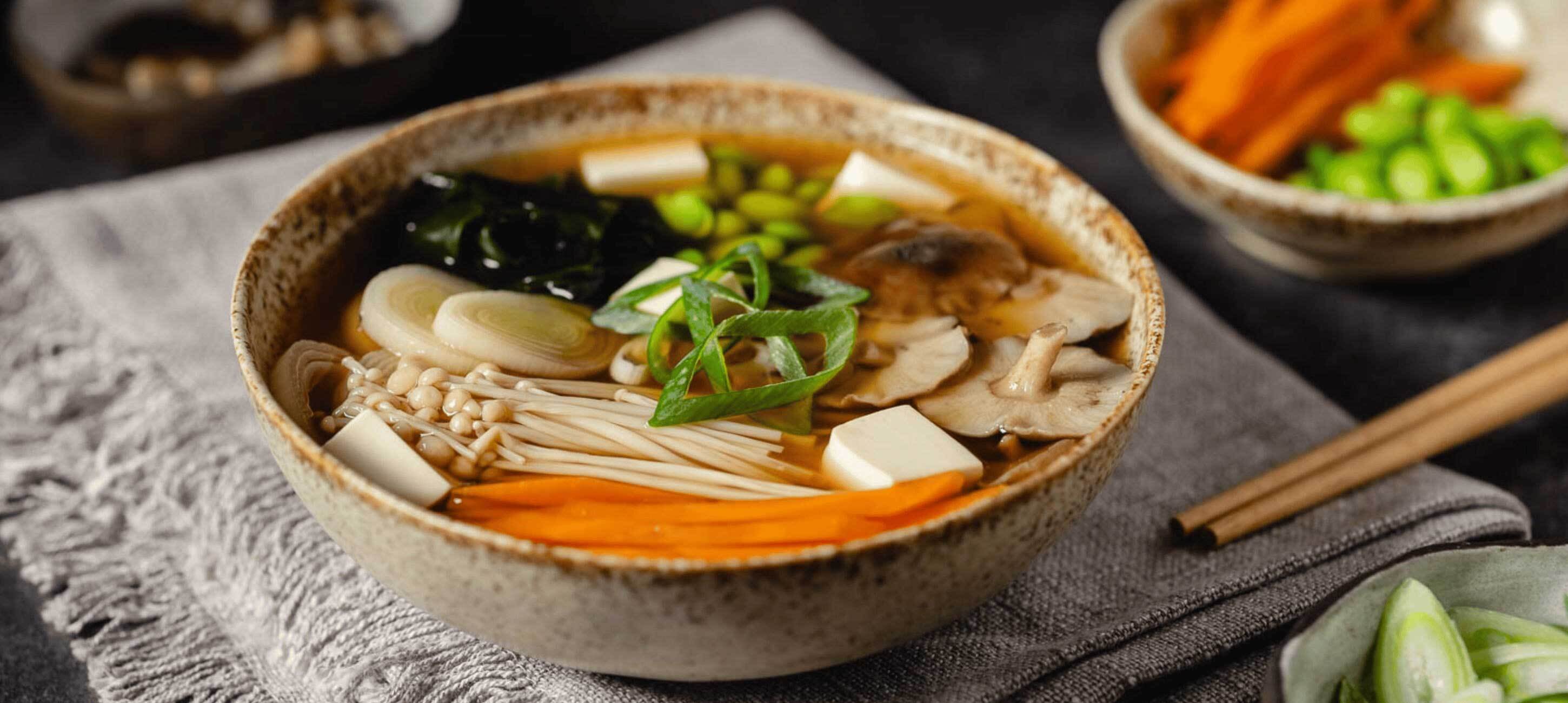- 2500 ml Wasser in einem Topf zum Kochen bringen und Dashi-Granulat hinzufügen. Gut umrühren. Das Gemüse nacheinander in der Brühe blanchieren: Shiitake 10 Minuten, Karotten, Lauch, Edamame und Wakame jeweils 3 Minuten. Enoki-Pilze nur 1 Minute kochen (oder roh servieren).
