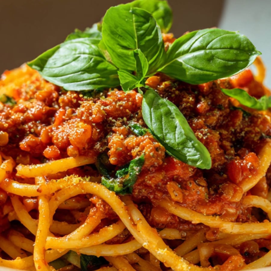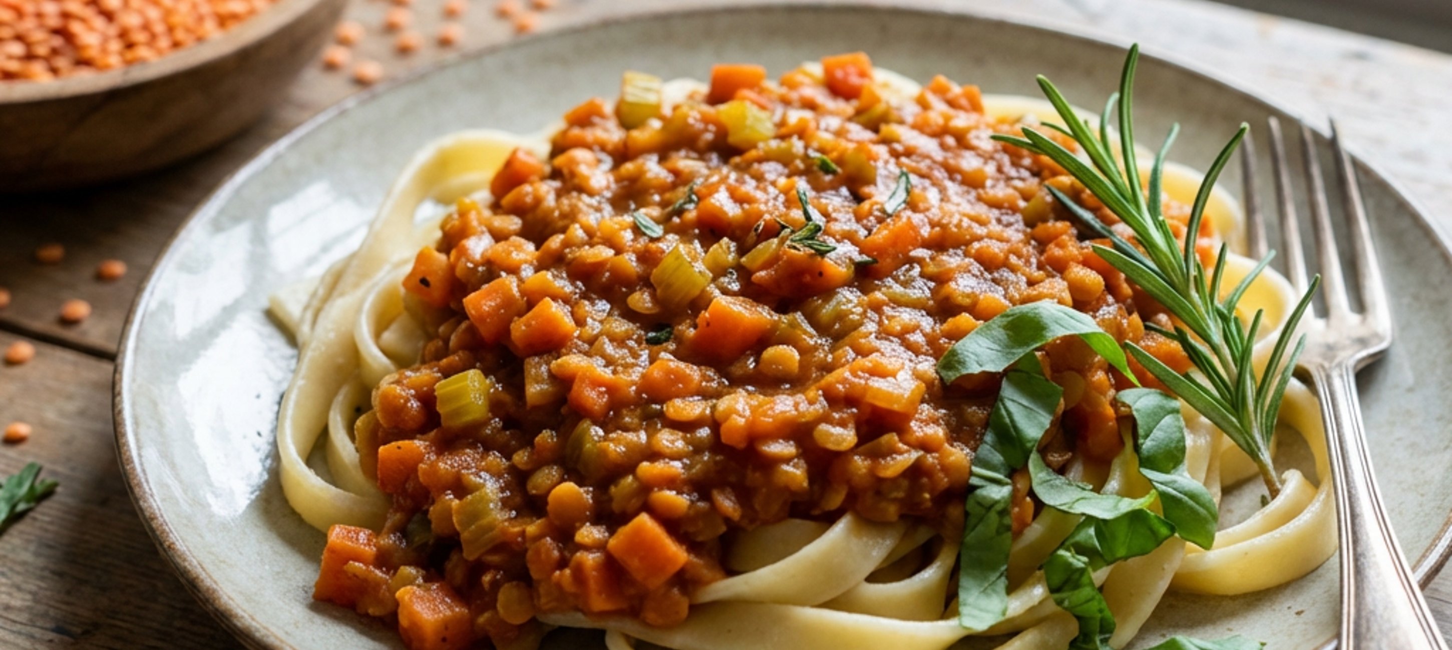 - 3Rote Linsen (roh und gespült), Rosmarin, gehackten Basilikum, Salz und Pfeffer hinzufügen. Die Sauce bei niedriger Hitze ohne Deckel mindestens 1 Stunde leicht köcheln lassen – zwischendurch umrühren und bei Bedarf etwas Flüssigkeit nachgießen. Am Ende sollte die Sauce sämig und das Gemüse ganz weich sein.