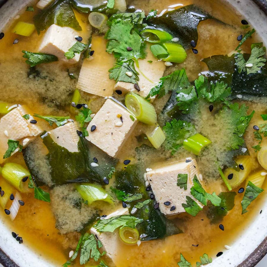 - 3Tofu, Frühlingszwiebeln und Sojasauce zur Suppe geben und weitere 5 Minuten sanft köcheln lassen. Dann die Miso-Paste sorgfältig einrühren und nochmals ca. 5 Minuten erhitzen, bis sich die Paste vollständig aufgelöst hat – nicht mehr stark kochen.