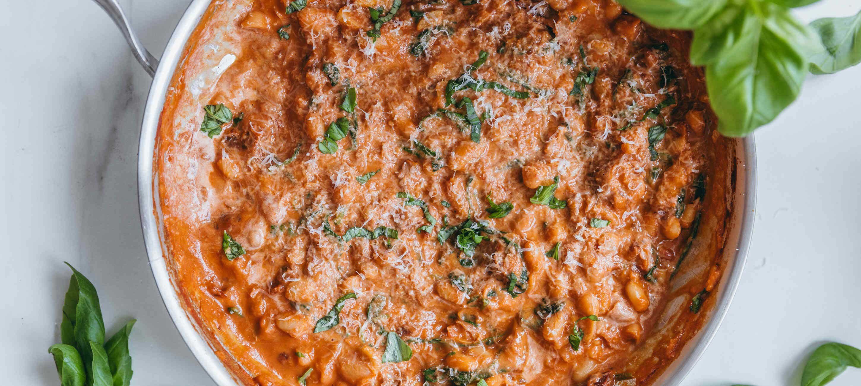 - 1Zwiebel fein würfeln und Knoblauch in dünne Scheiben schneiden. Eine Pfanne erhitzen und das Öl hineingeben. Zwiebel darin glasig dünsten, dann Knoblauch und klein geschnittene getrocknete Tomaten hinzufügen. Tomatenmark einrühren und kurz mitrösten. Mit Passata und Brühe ablöschen, die abgespülten Bohnen hinzufügen und alles gut vermengen.