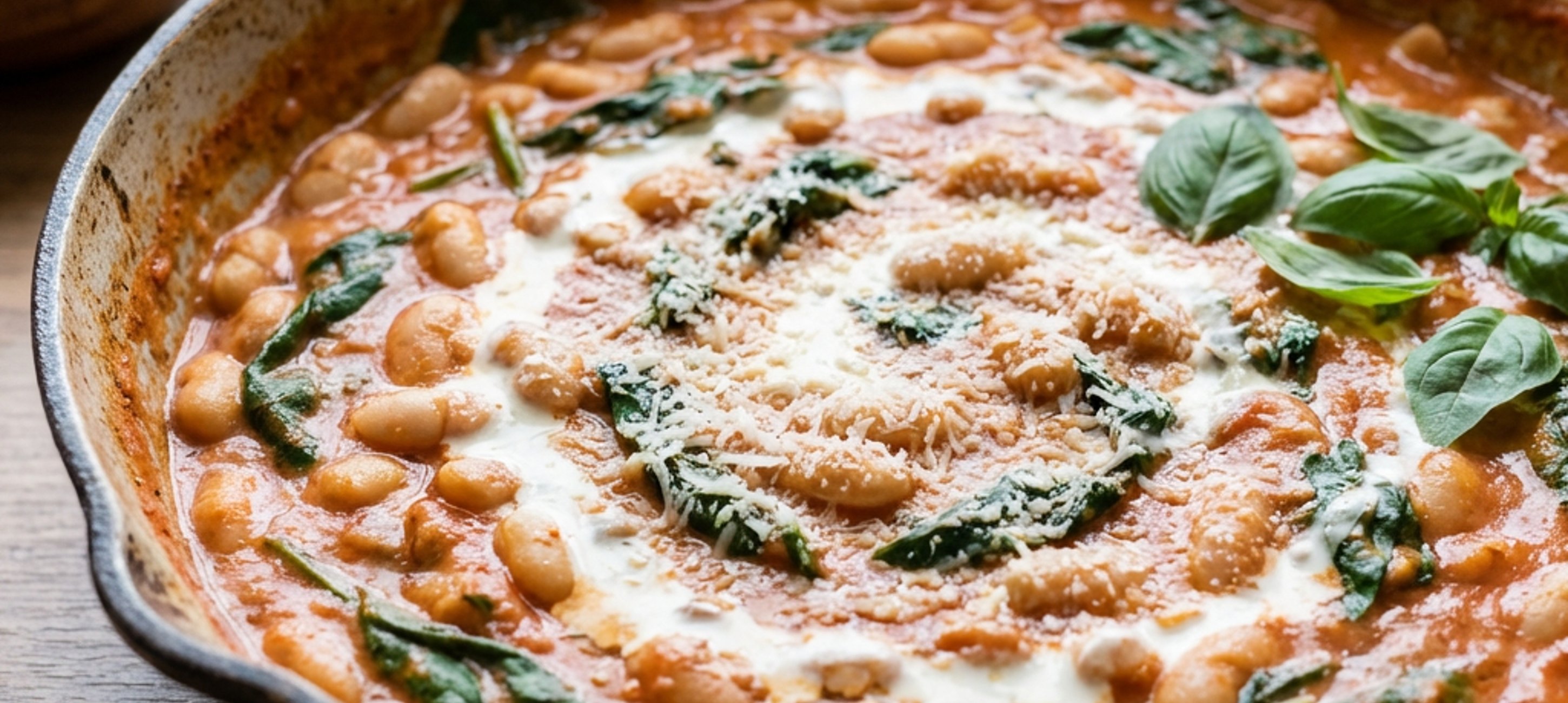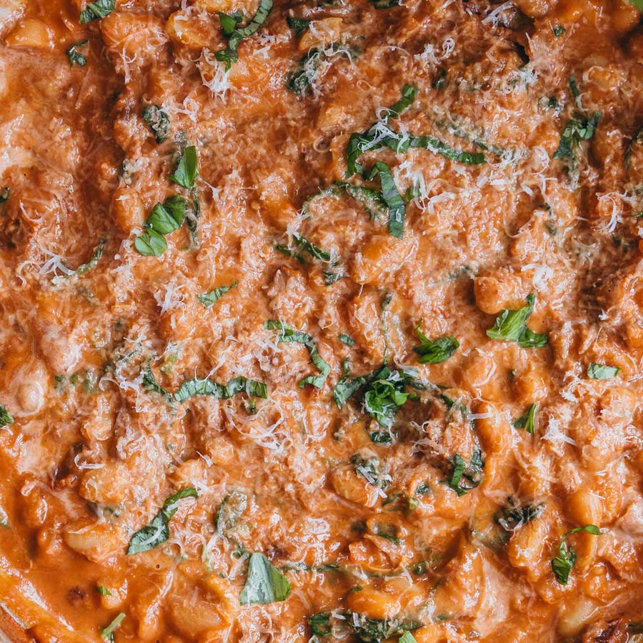 - 2Etwa 10 Minuten köcheln lassen, bis die Sauce sämig eingedickt ist. Mit Salz und Pfeffer abschmecken (vorsichtig mit Salz, da viele Zutaten bereits salzig sind). Basilikum und Spinat unterrühren. Zum Schluss mit Sahne und Parmesan verfeinern. Mit geröstetem Brot servieren. Guten Appetit!