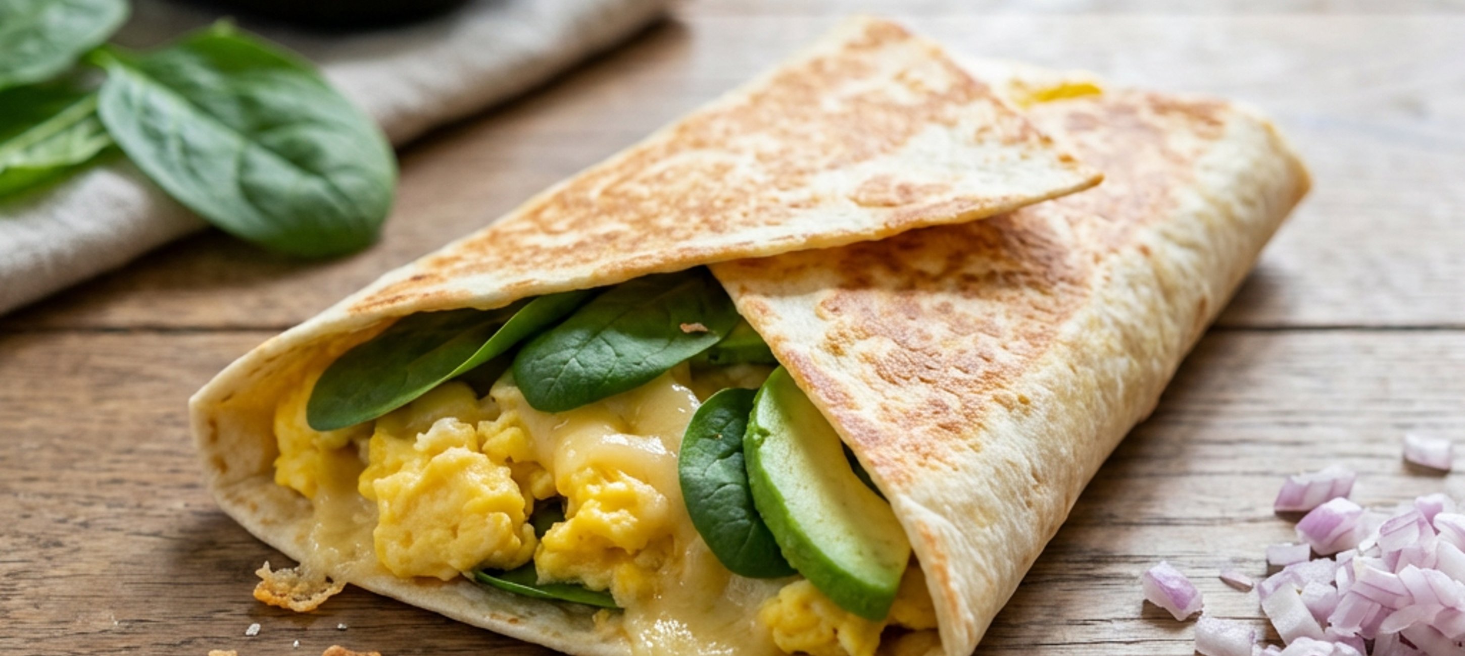 - 3Die Tortilla vierteln. Jedes Viertel mit einer anderen Zutat befüllen: Eine in Scheiben geschnittene Avocado, das Rührei und eine Handvoll gehackter Schalotten auf die Tortilla-Viertel legen. Darauf dann den Käse legen und abschließend eine Handvoll Babyspinat drapieren.