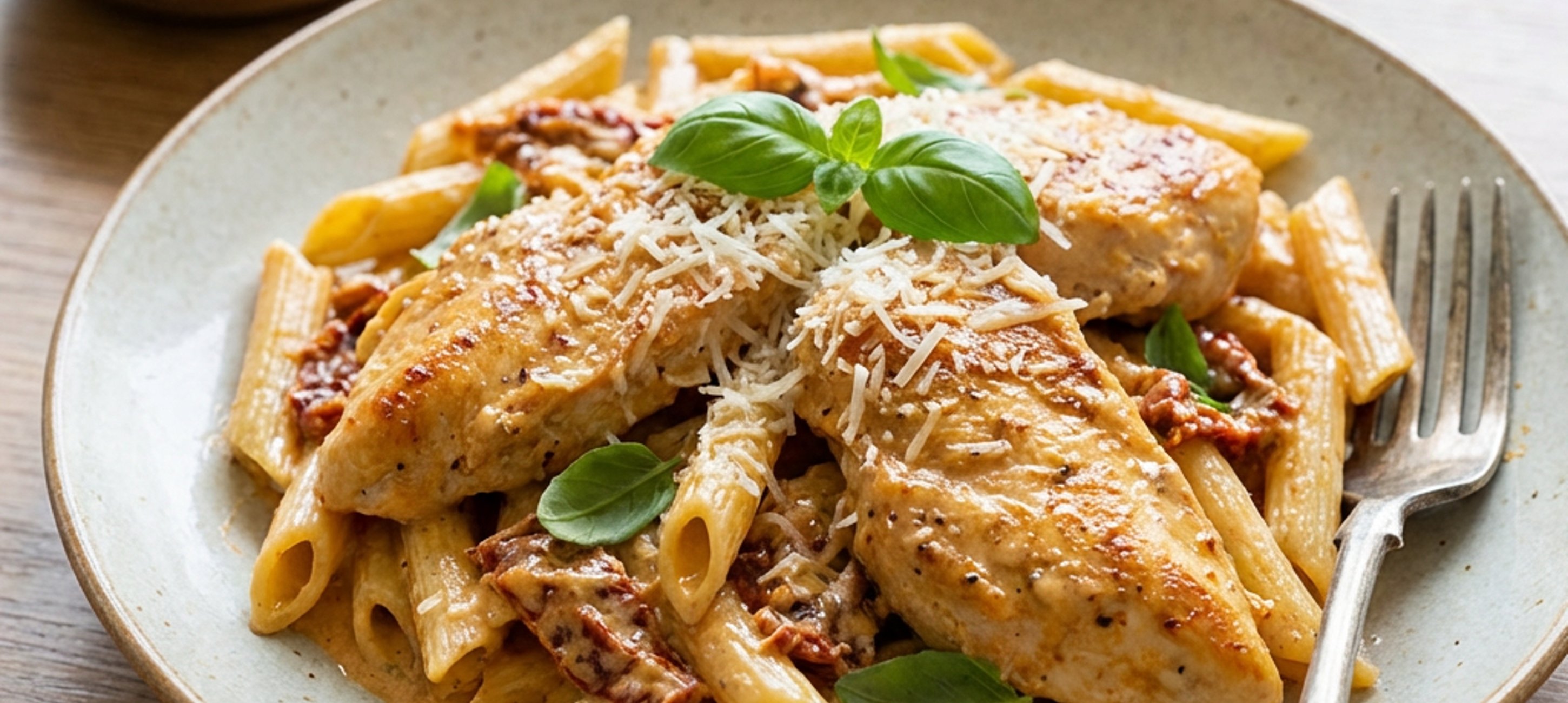 - 1Einen großen Topf mit reichlich gesalzenem Wasser zum Kochen bringen. In der Zwischenzeit die Zwiebel fein würfeln, den Knoblauch in dünne Scheiben schneiden und die getrockneten Tomaten in kleinere Stücke schneiden. Die Hähnchenbrust putzen und in Streifen oder mundgerechte Stücke schneiden.