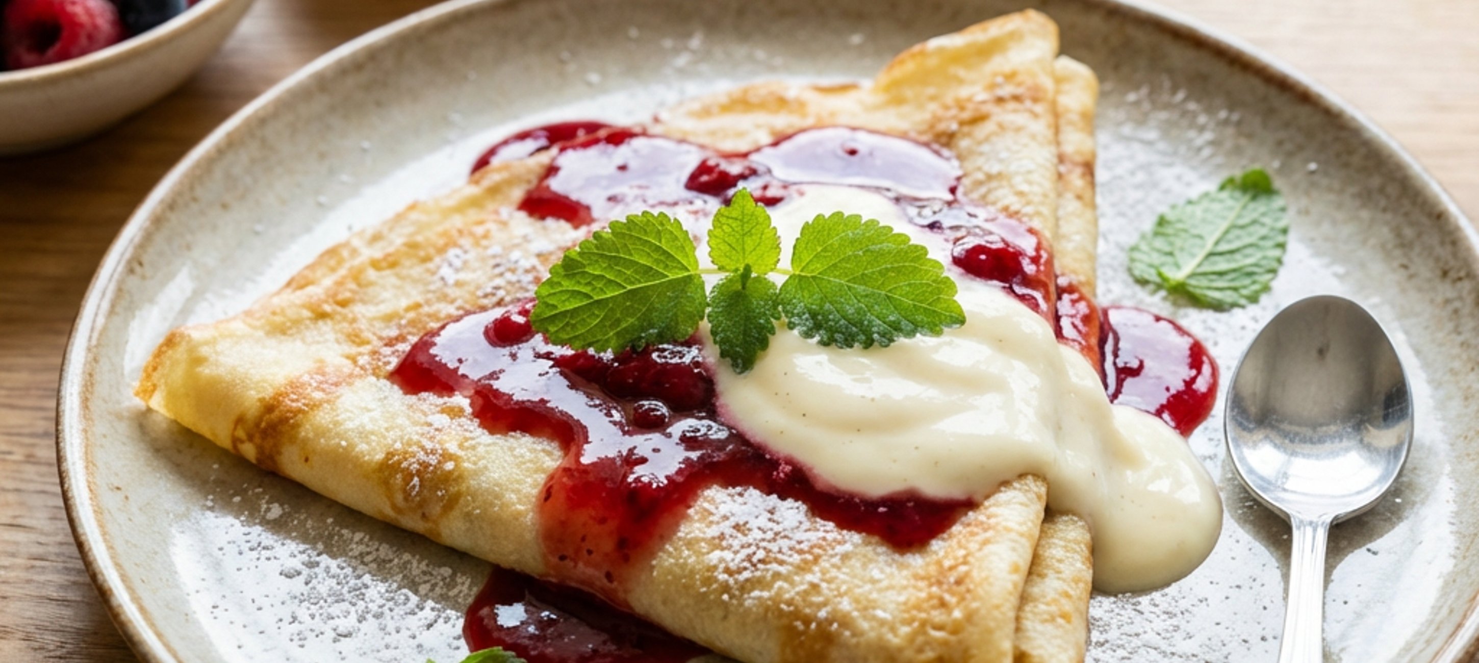 - 2Vanille-Joghurt auf die eine Hälfte des Crêpes verteilen, danach den Crêpe zu einer Tüte falten und hierauf dann die Beerensoße gießen. Abschließend alles mit Puderzucker bestäuben sowie mit Zitronenmelisse garnieren und anrichten.