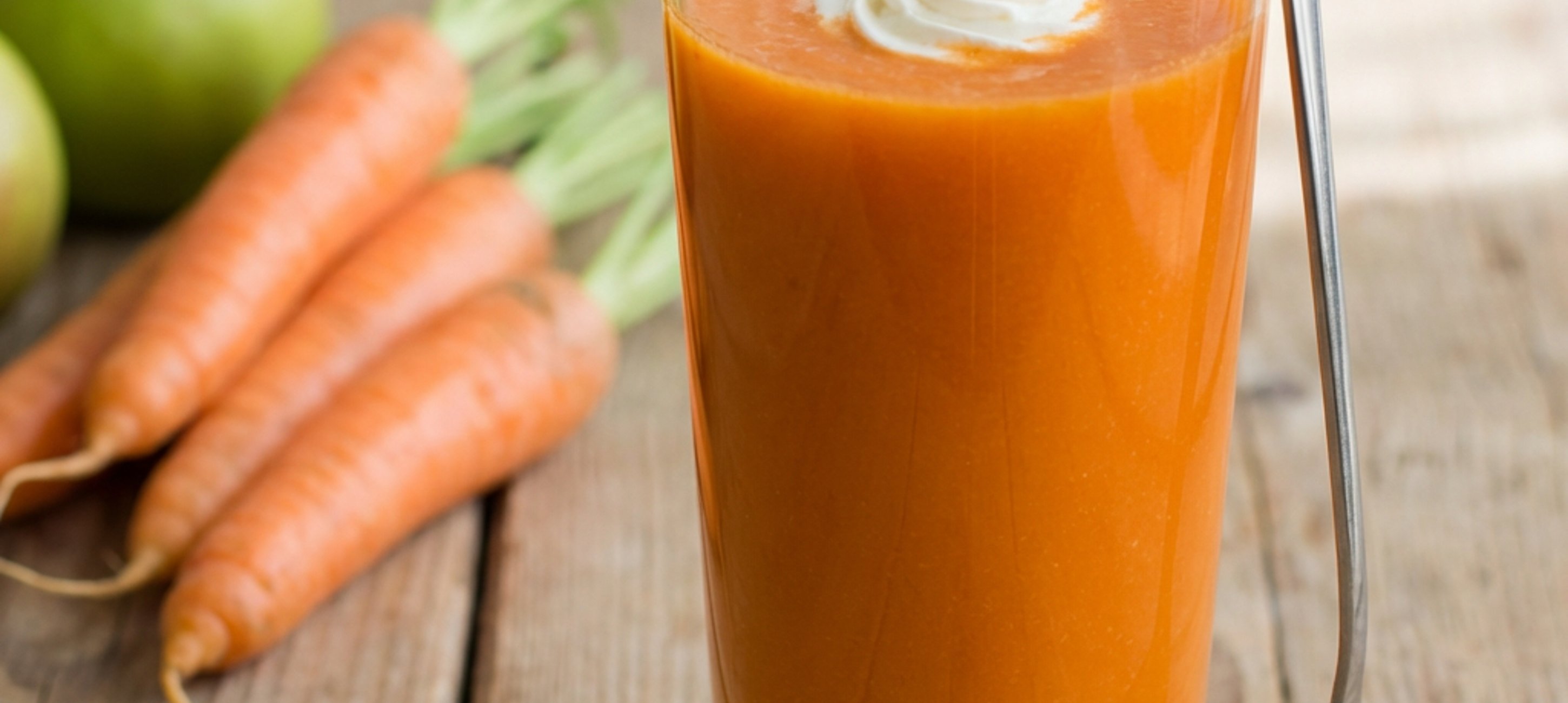 - 2Alles nacheinander mit einen Entsafter oder alternativ mit einem Pürierstab durchpürieren. Den Gemüsesaft in Gläser füllen, mit einen Klecks Sahne leicht vermischen und servieren.