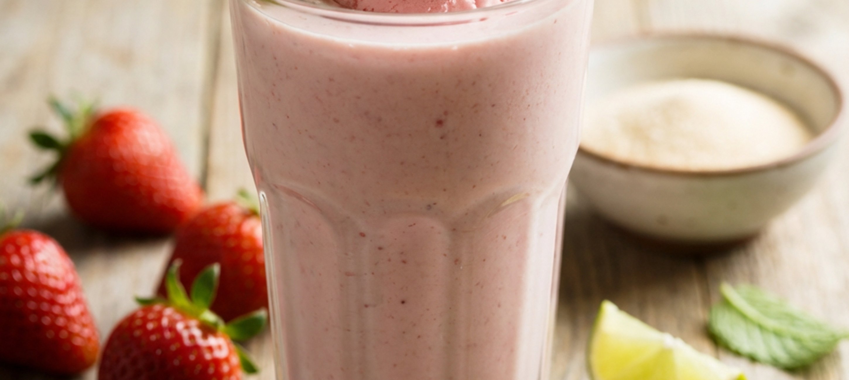 - 1Die Erdbeeren waschen, putzen und fein pürieren. Während des Pürierens Vanillezucker, Limettensaft und Vanille-Eis hinzufügen. Danach die Milch vorsichtig dazugeben.