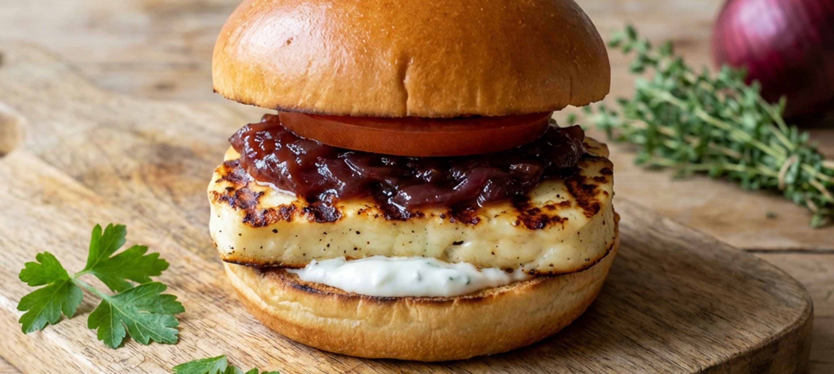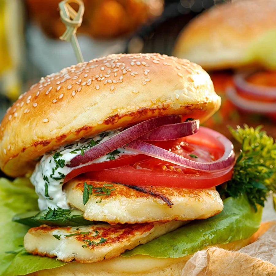 - 3Die Unterseite des Brötchens mit dem vorbereiteten Dip bestreichen und Salatblätter darauflegen. Nun den gegrillten Halloumi-Käse auf die Salatblätter drapieren. Auf den Halloumi-Käse wiederum eine Scheibe Tomate und ein paar Gurkenscheiben legen. Anschließend das Zwiebel-Chutney über die Gemüsescheiben verteilen und zum Schluss die Oberseite des Brötchens mit dem Dip bestreichen, um hiermit den Burger zu bedecken.