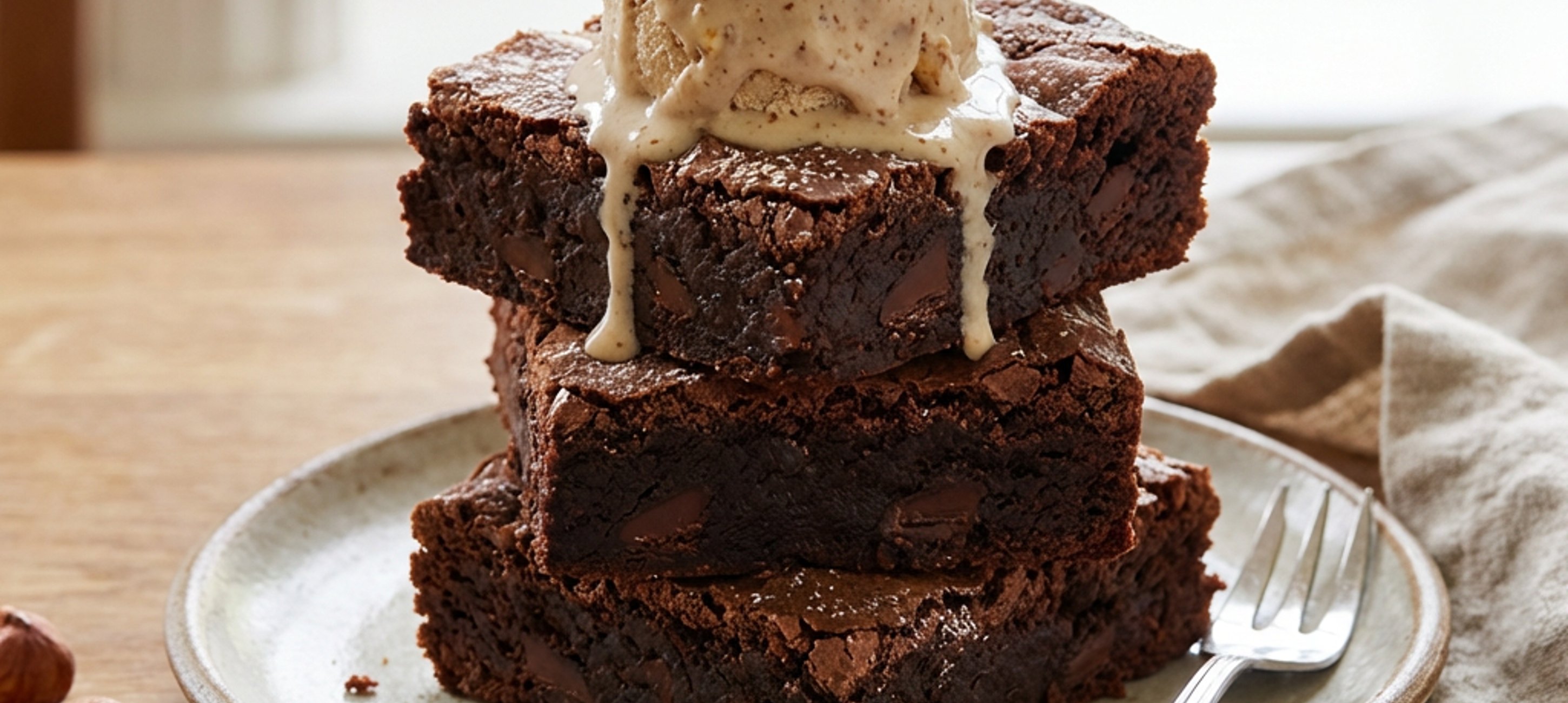 Nimm deine Brownies am besten knapp 2 Minuten früher aus dem Backofen. Denn dann sind sie noch saftiger. Und für den extra Schoko-Kick kannst du außerdem noch 100 g Zartbitterschokolade im Wasserbad schmelzen und diese dann über deine fertig gebackenen Brownies gießen. Immer ein Hit: die noch ofenwarmen Brownies mit einer Kugel Nuss-Eis servieren!