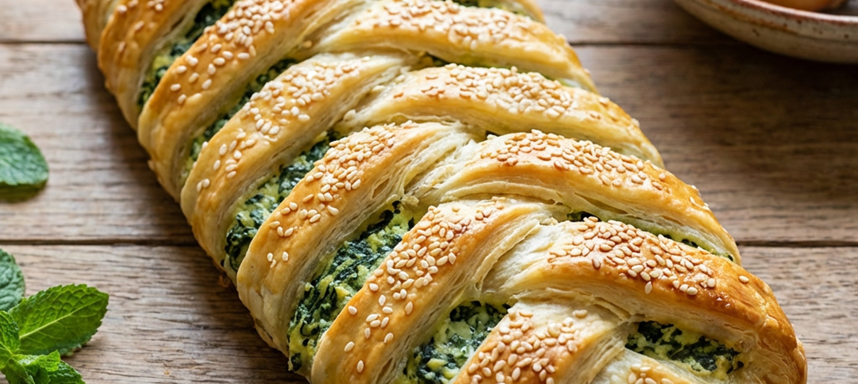 - 3Ofen auf 200 °C Umluft vorheizen. Die Spinat-Masse nun in die Mitte des Blätterteigs geben. Danach die Teigstreifen abwechselnd von links und rechts, also nach dem Reisverschluss-Prinzip, über die Spinat-Masse drüberlegen. Den Blätterteig mit der bereits verquirlten Ei-Wasser Masse bestreichen, danach mit Sesam bestreuen und bei 200 °C Umluft für 40 Minuten backen und servieren.