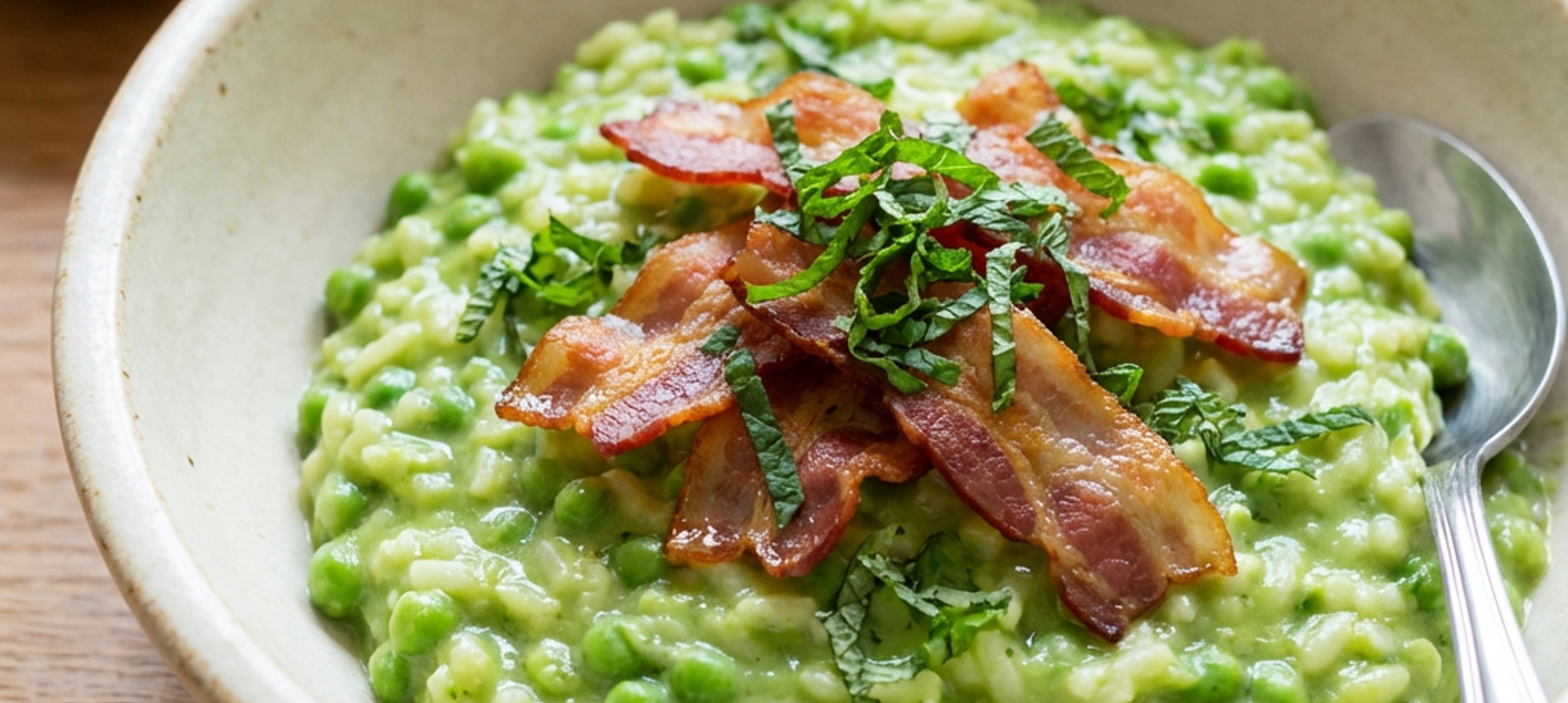 - 3Nun die eine Hälfte der bereits aufgetauten Erbsen pürieren. Danach dieses Püree mit den übrigen Erbsen, den geriebenen Grana Padano und Butter unter das fertig gegarte Risotto einrühren. Zum Schluss alles mit Salz und Pfeffer abschmecken, mit Bacon und der feingehackten Minze bestreuen und anrichten.
