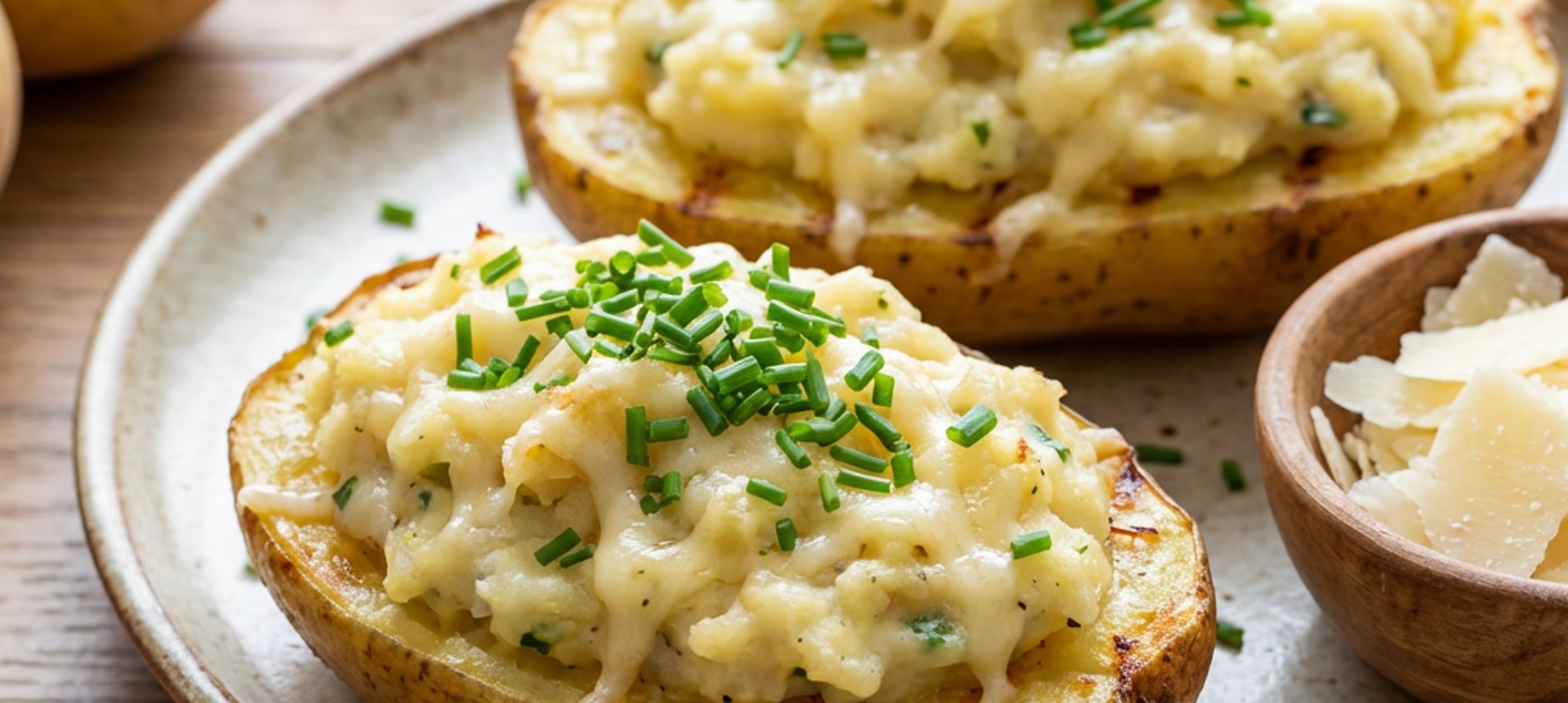 - 1Kartoffeln für ca. 35 Minuten kochen, abkühlen lassen, längs halbieren und aushöhlen. Hierbei einen 2 cm dicken Rand übrig lassen. Parmesan hobeln. Schnittlauch in feine Röllchen schneiden.