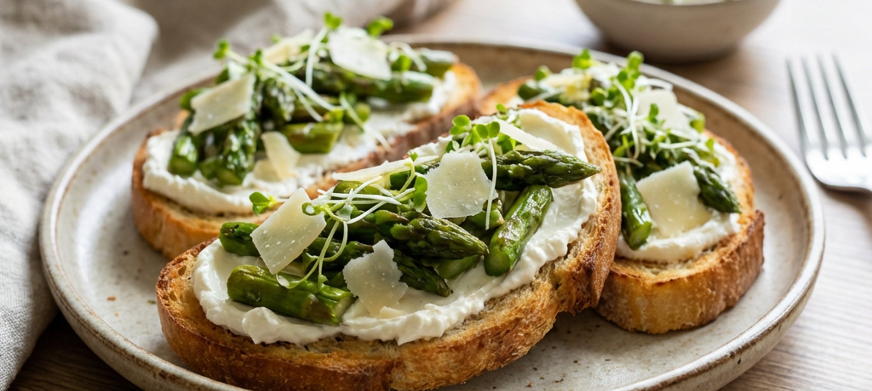 - 6Die gerösteten Brotscheiben großzügig mit Frischkäse bestreichen und mit den Spargelstücken belegen.