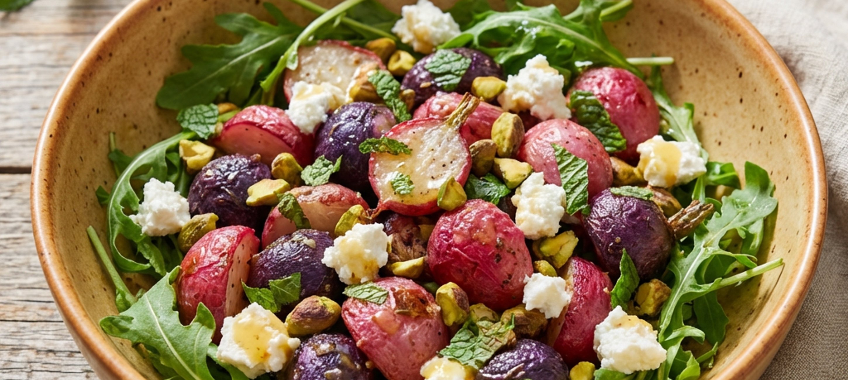 - 5In einer großen Schüssel Rucola, Ziegenkäsestücke, geröstete Radieschen, gehackte Minze und Pistazien vermengen. Mit dem Dressing beträufeln und alles vorsichtig vermischen.