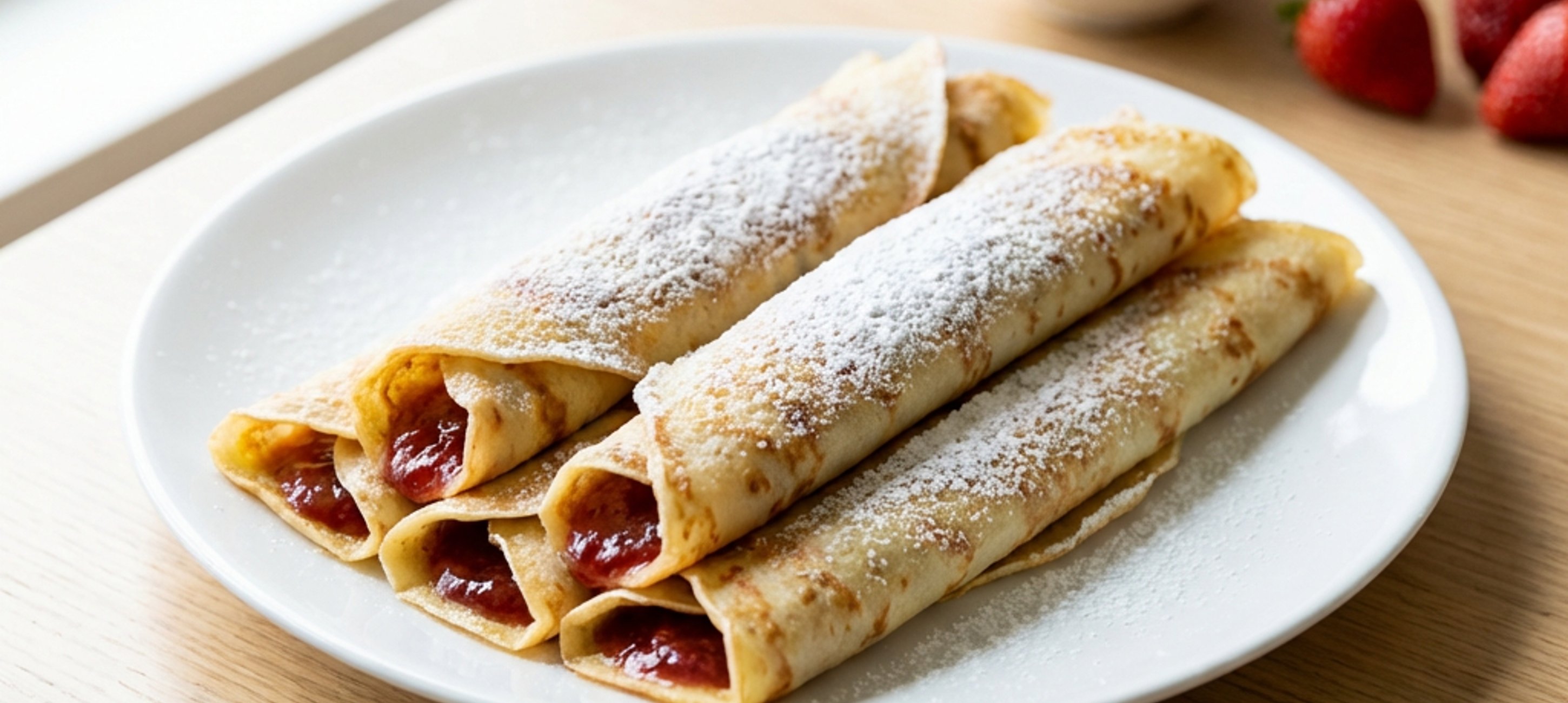 - 4Die fertigen Pfannkuchen auf einen Teller geben, großzügig mit Konfitüre bestreichen, fest aufrollen und mit Puderzucker bestäuben. Warm servieren.