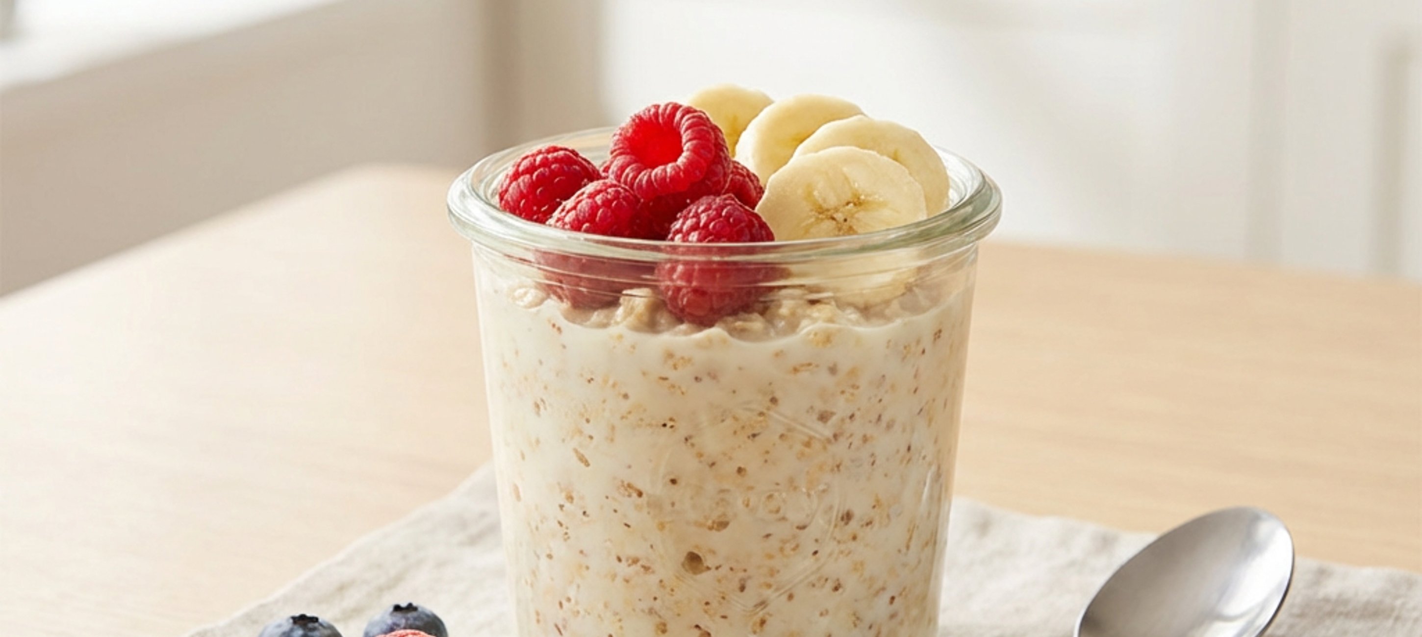 - 4Nehmen Sie das Glas morgens aus dem Kühlschrank und genießen Sie die Oats direkt kalt oder füllen Sie sie in eine Schüssel um. Nach Belieben mit frischem Obst garnieren.