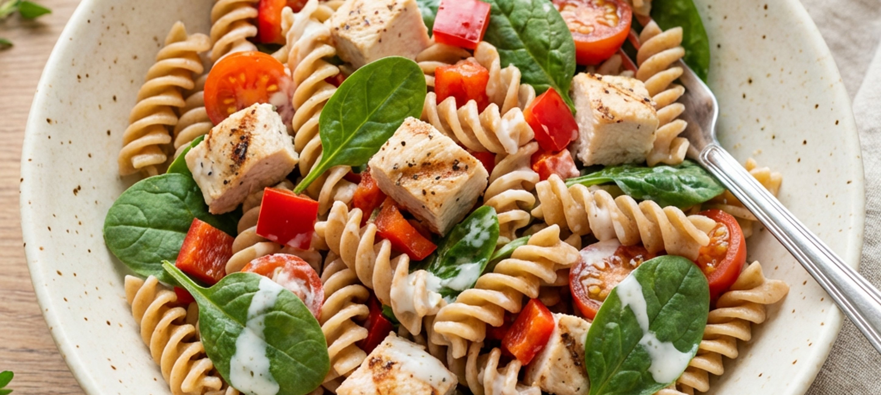 - 5In einer großen Schüssel die abgekühlten Nudeln mit den Hähnchenwürfeln, Paprikawürfeln, halbierten Kirschtomaten, dem Babyspinat und dem Joghurt-Dressing vermengen. Den Salat nach Belieben nochmals mit Salz und Pfeffer abschmecken und servieren. Am besten schmeckt der Salat gut gekühlt aus dem Kühlschrank.