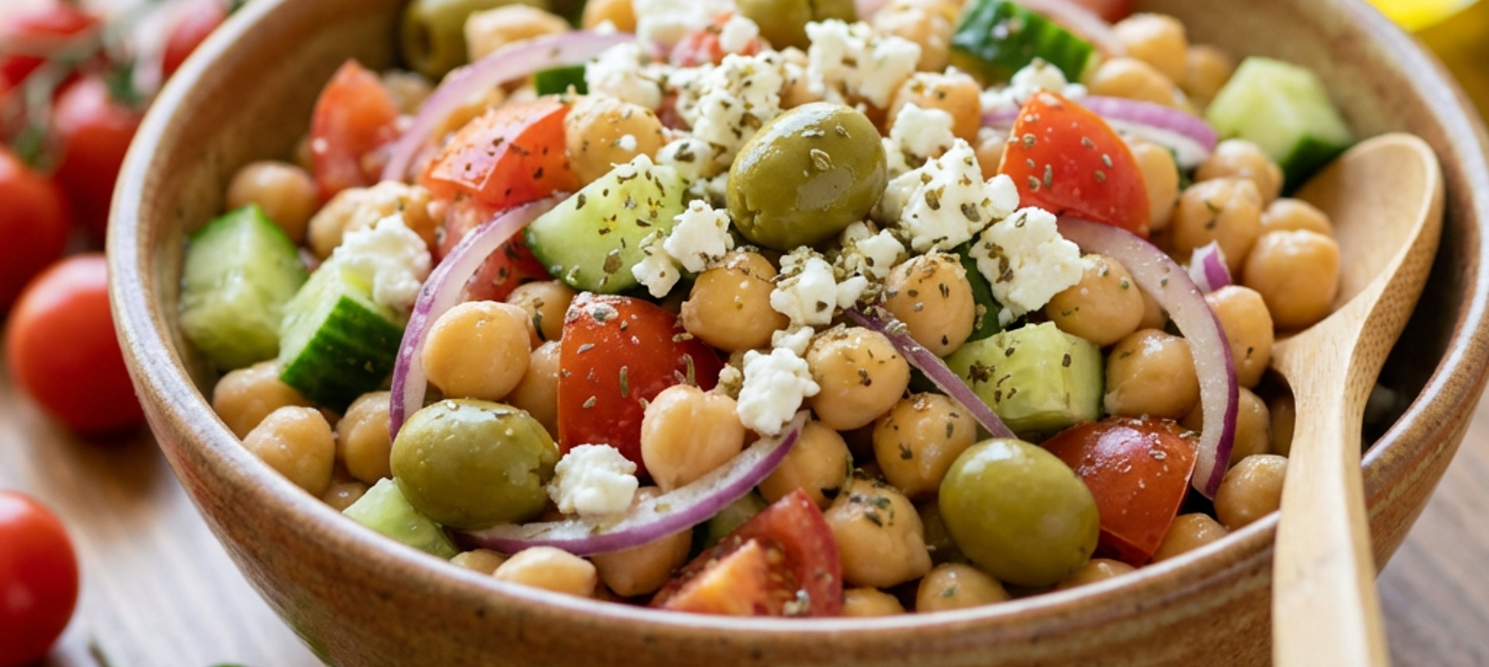 - 2Kichererbsen, Zwiebelstreifen, Gurken- und Tomatenwürfel in eine große Schüssel geben. Die Oliven hinzufügen und den Feta mit den Händen grob über den Salat bröseln.