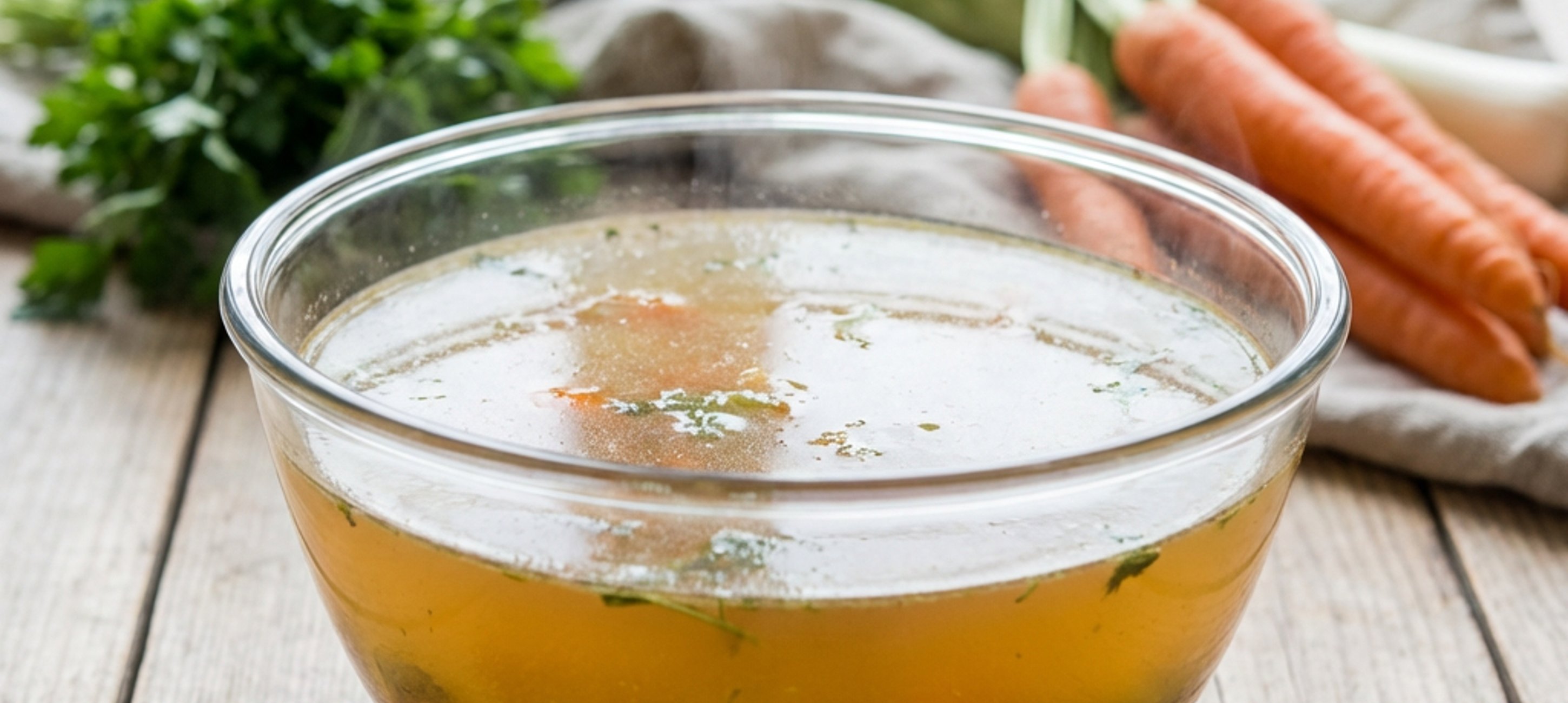 - 5Die Brühe bei minimaler Hitze ohne Deckel etwa 45 Minuten sanft köcheln lassen. Wichtig: Währenddessen nicht umrühren, damit die Brühe klar bleibt! Danach durch ein feines Sieb in einen sauberen Topf abseihen. Die Brühe am besten schnell abkühlen lassen (z. B. im Spülbecken mit Eiswasser). Nach dem Erkalten eventuell erstarrtes Fett von der Oberfläche abnehmen.