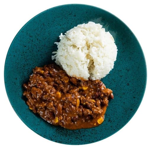 Gekochter Jasminreis 45%, Rinderhackfleisch 30%, rote Bohnen 20%, Mais, rote Paprika, geschälte Tomaten, Zwiebeln, süßes Paprikapulver, Sonnenblumenöl, Knoblauch, Chili 0,5%, Speisesalz, Pfeffer, Thymian, ganzer Kreuzkümmel.