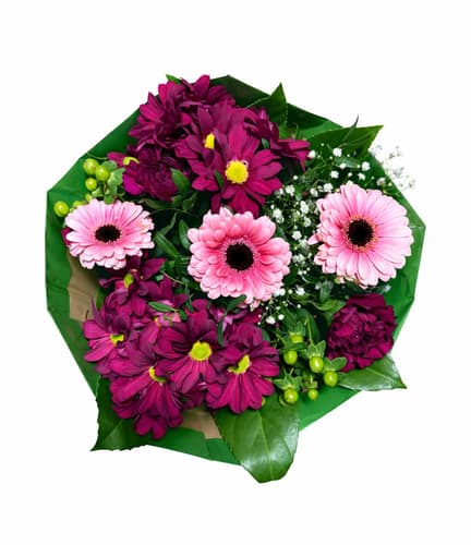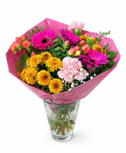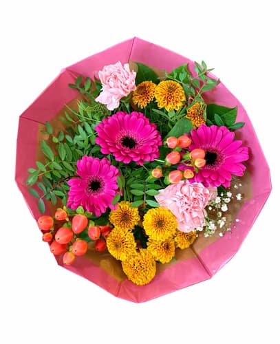 "The classically bound, cheerful bouquet with seasonal flowers is a beautiful gift or souvenir.