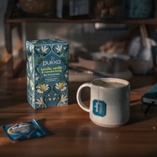 Each Pukka organic tea bag is completely plastic-free and comes in its own recyclable envelope to preserve the essential oils of our organic herbs. Each tea bag has two chambers in which these incredible herbs are located and in which the herbal power can escape into your cup. To allow the flavours to fully develop, boiling water should be poured directly onto the bag. Every plant loves water, so let your tea steep for the perfect moment of enjoyment. And remember to only boil the amount of water you need to make your tea as environmentally friendly as possible.