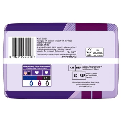 Bladder weakness doesn’t have to mean putting your life on hold. With Always Discreet Boutique Underwear Plus Size M, you can continue with your day as normal even when you experience moderate to heavy leaks caused by a sudden urge to urinate and need protection that stays securely in place. The super absorbent underwear has a rapid dry technology that traps odours in seconds for incontinence odour control. The double leak guards help stop leaks where they happen most. The 360° FormFit design and comfortable waistband give a smooth and comfortable fit, so you can move with confidence while experiencing amazing discretion. Try Always Discreet Incontinence Underwear Plus Size M. Also suitable for postpartum incontinence. If you’re looking for black incontinence pants and incredible protection, try our Always Discreet Boutique Underwear.