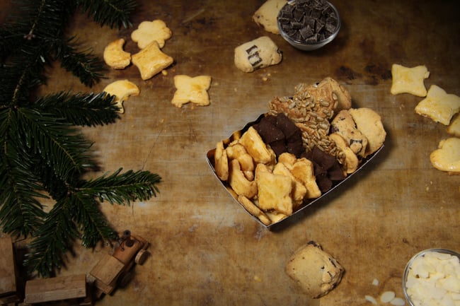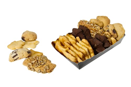 Mixed butter cookies, a diverse selection of butter cookies, chocolate shortbread, and butter cookies with caramelized sunflower seeds.