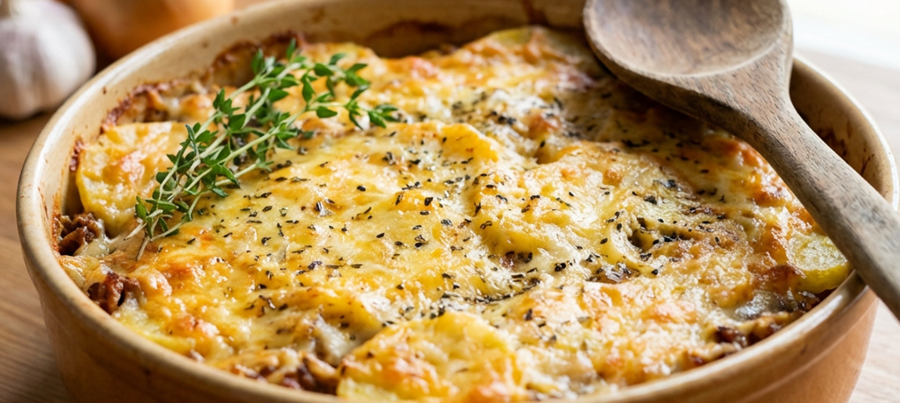 - 7Bake the bake at 180 °C (fan-assisted) on the middle rack for about 40 minutes, until golden brown on top and the potatoes are cooked through. Before serving, garnish the bake with fresh thyme.