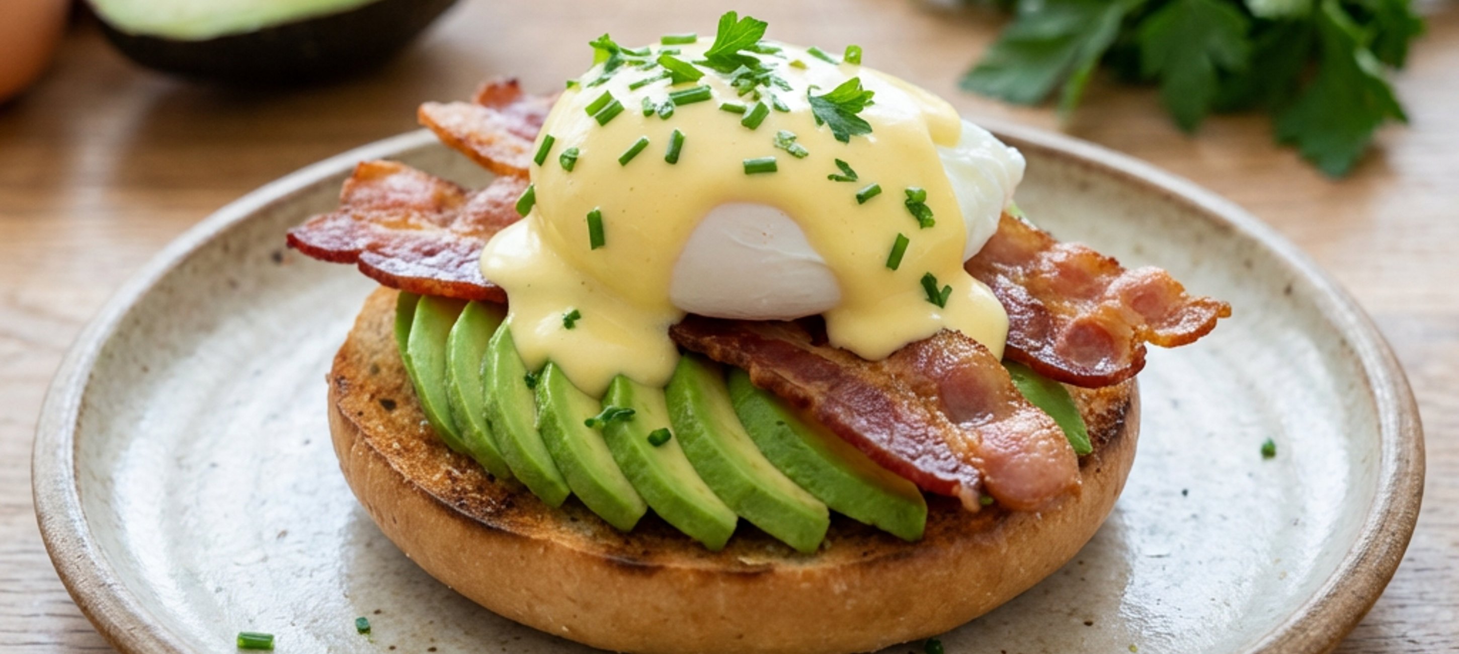 - 5First, spread the avocado and bacon on the bagels, then place an egg on each. Spoon the Hollandaise sauce over the egg. Sprinkle with chives and parsley and top with the second bagel half.