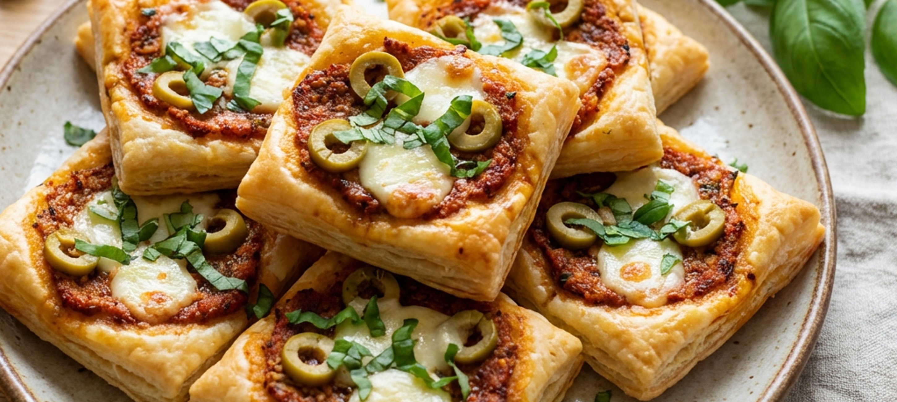 - 3Preheat the oven to 180 °C convection. Top the dough rectangles with olives and mozzarella. Bake in the preheated oven for 10 to 12 minutes. Meanwhile, roughly chop the basil leaves and sprinkle them over the finished pizza pieces.