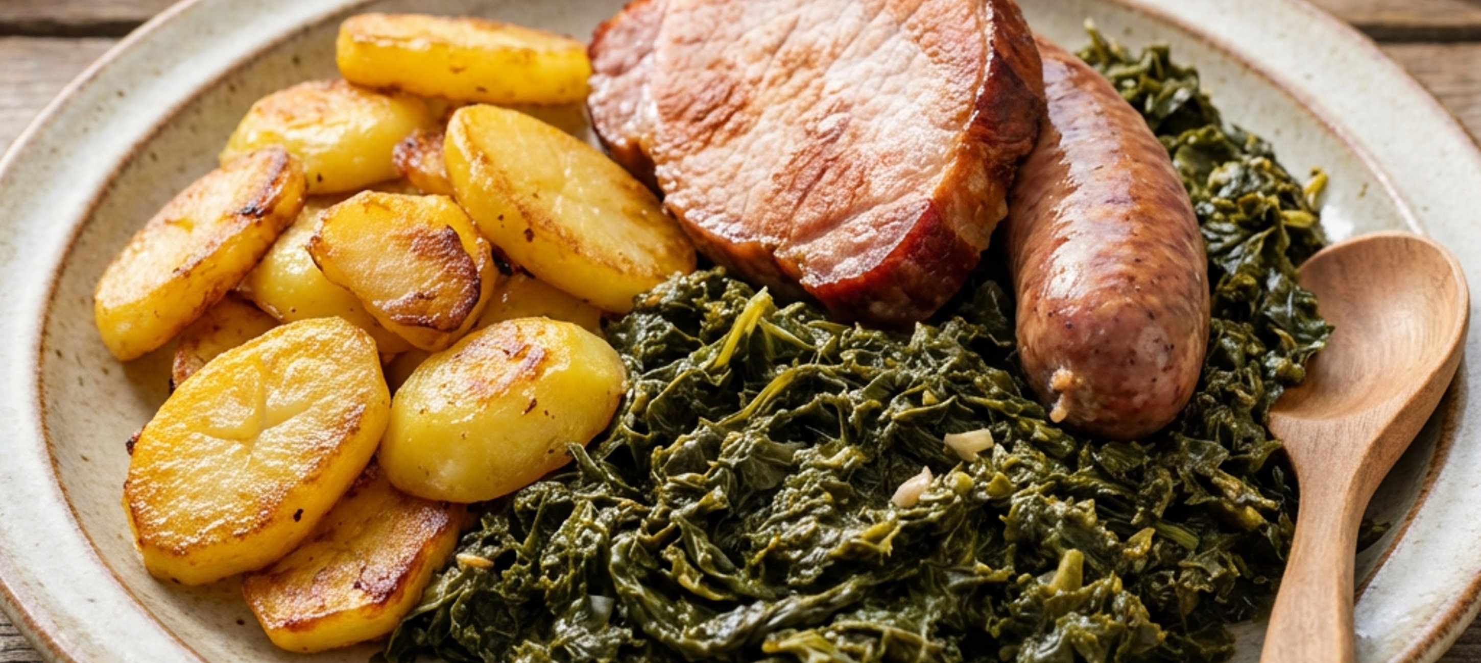 - 4Now sprinkle sugar over the fried potatoes and let it caramelize. Then remove the Kasseler chops and Pinkel sausage from the pot and keep them warm. Finally, season the finished kale with salt and pepper and serve with Kasseler chops, Pinkel sausage, and the caramelized fried potatoes.