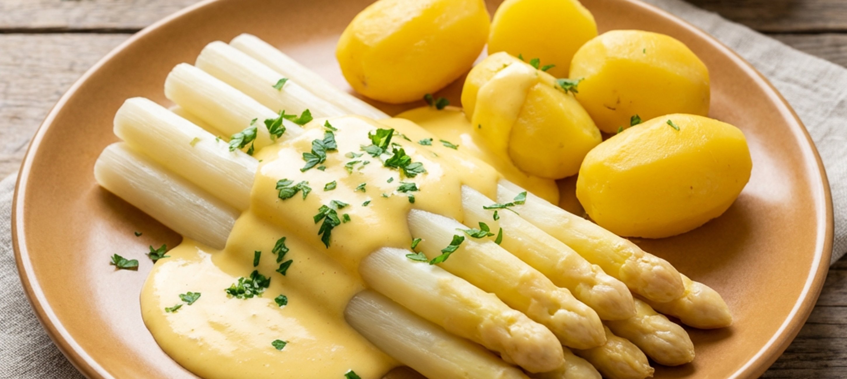 - 6Arrange the asparagus with the potatoes and pour the Hollandaise sauce over them. Garnish with a little melted butter, if desired.
