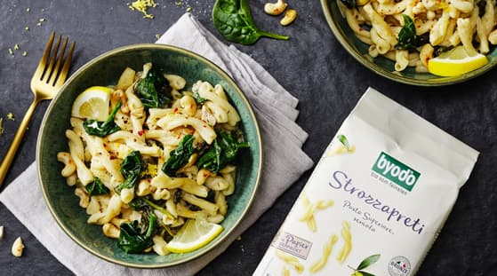 Die Themen Nachhaltigkeit, Qualität und Genuss treiben uns bei Byodo an. Die Umstellung der Byodo Pasta auf eine 100 % Papierverpackung war daher nur folgerichtig. Diese ist nachhaltig und 100 % recyclebar! Die Pasta selbst bleibt in gewohnt höchster 100% Bio-Qualität. Denn die schonende Herstellung und die Verwendung bester Rohstoffe garantieren jedem Pasta-Liebhaber köstliche Genussmomente.