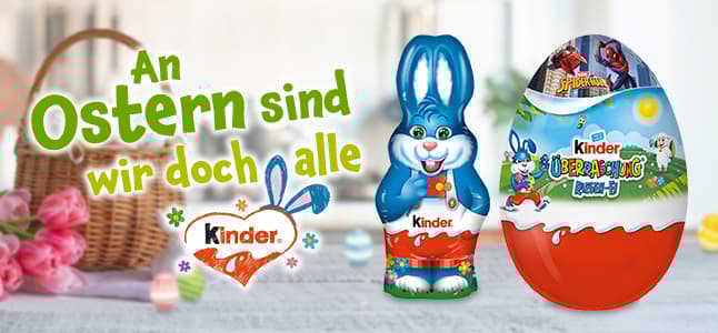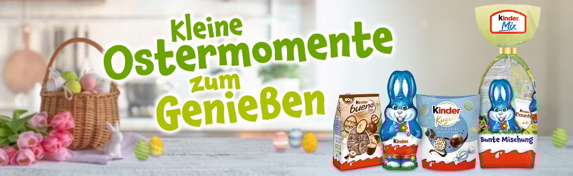 Auch dieses Jahr überrascht kinder mit genussvollen Produkten. Der Osterhase für jedes Osternest, rundum gelungene Schokoladenkugeln, bunte Geschenkpackungen, tolle Überraschungen und ein liebevoll gestalteter Mix - die Osterprodukte von kinder lassen die Herzen von Groß und Klein höherschlagen. Dann ist die Freude groß, wenn der Osterhase endlich da ist.