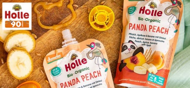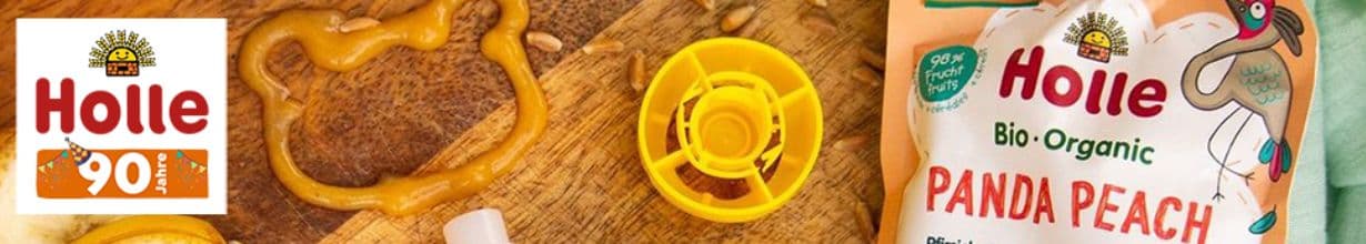 - Fünf Holle-Pakete, jeweils gefüllt mit 3 Pouchies, 1 Crunchy Snack, 1 Getreidebrei, 1 Fruchtriegel und 1 Holle-Gläschen.