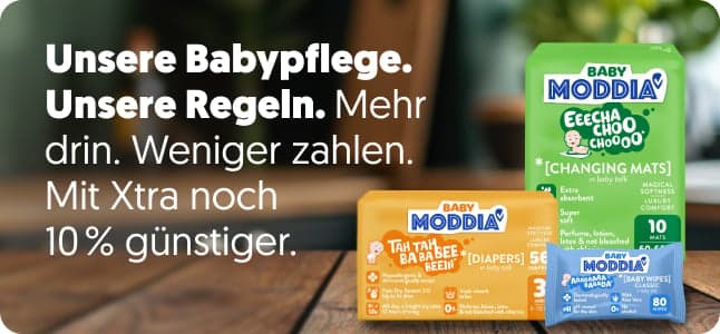 Elternsein bringt Überraschungen – einige süß, andere... weniger süß. Deshalb haben wir Moddia Baby ins Leben gerufen, unsere eigene Marke, die sich um das Chaos kümmert, ohne das Drama. Ultra-absorbierende Windeln, die Auslaufen verhindern, Trainingshosen, die sich wie Unterwäsche anfühlen, und biologisch abbaubare Feuchttücher, die das Durcheinander nicht nur herumschieben. Hypoallergen, dermatologisch getestet und ganz ohne Chemikalien. Weich, atmungsaktiv, preiswert und bereit für das echte Leben. Denn du hast schon genug auf dem Teller – im wahrsten Sinne des Wortes.