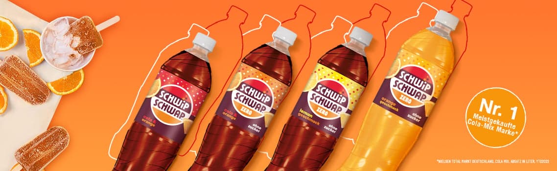 Das unvergleichlich leckere Cola-Mixgetränk mit einem Schuss Orangensaft Schwip Schwap schmeckt erfrischend nach Cola und fruchtig nach Orange.
