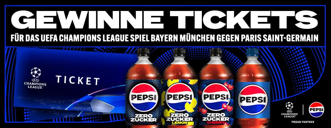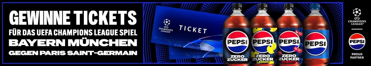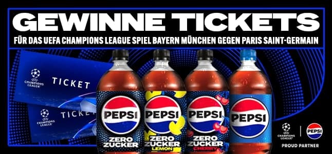 Wir verlosen gemeinsam mit Pepsi 1 x 2 Tickets für das Champions League Spiel Bayern München gegen Paris Saint-Germain in der Allianz Arena am 26.11.2024. Kaufe jetzt PepsiCo Softdrinks im Wert von mindestens 10 € aus unserem Shop und schon bist Du automatisch im Lostopf. Wir wünschen Dir viel Glück!