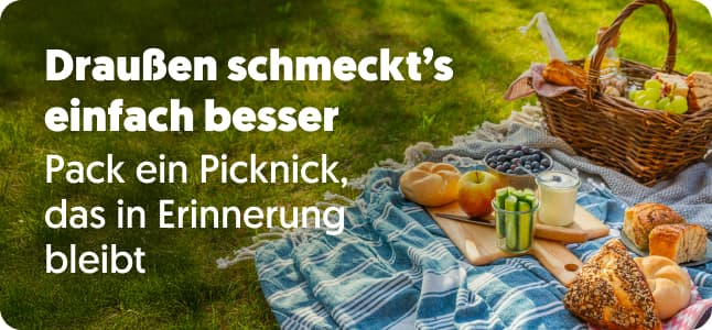 Ob auf der Wiese im Park oder im eigenen Garten: Knuspr bringt dir alles, was du für ein perfektes Picknick brauchst. Frisches Brot, saftiges Obst, herzhafte Häppchen, kleine Snacks zum Knabbern und kühle Drinks – innerhalb von 3 Stunden geliefert. Auch die schwere Wassermelone tragen wir für dich. Supermarkt? Gespart. Mehr Genuss, weniger Stress – so geht Picknick heute.